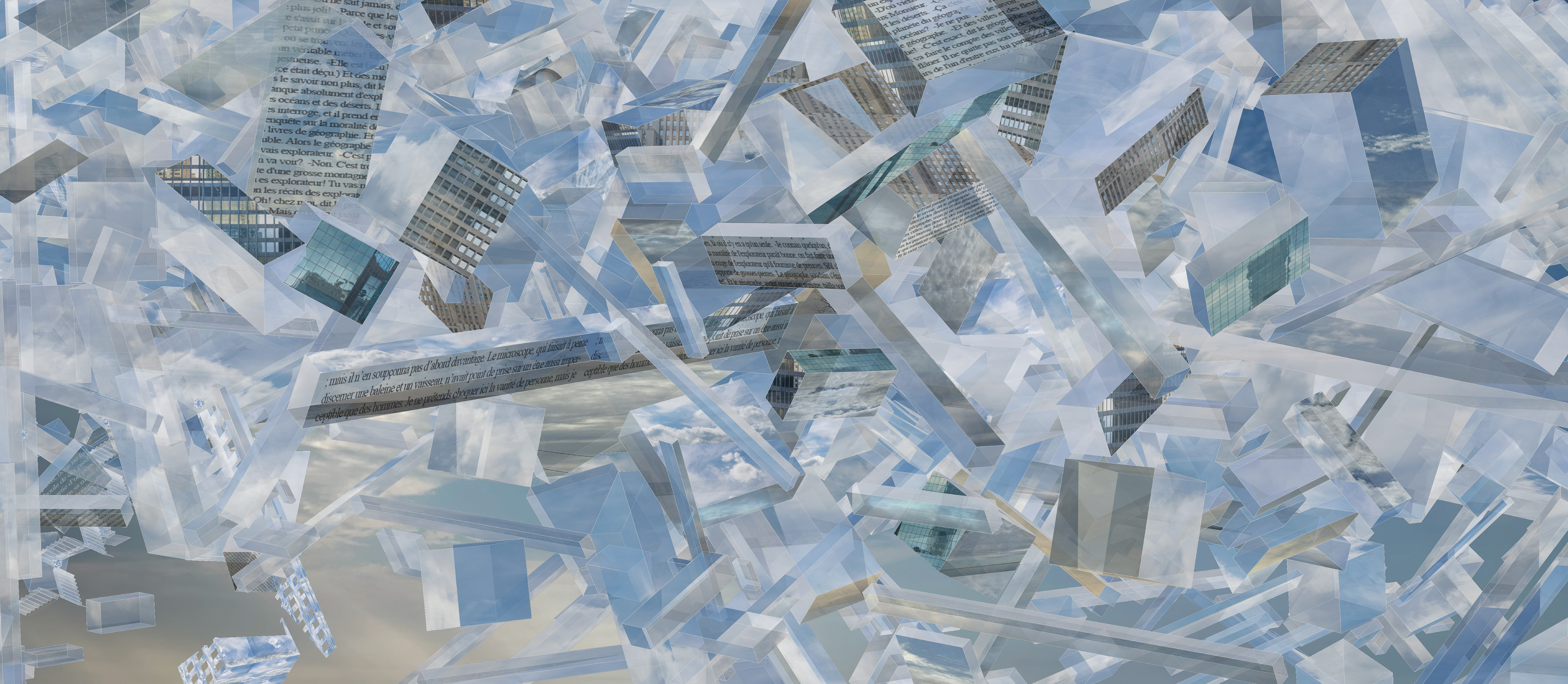 ‘Géographie de la Lumière | Geography of Light’ – This was a proposal for a wall-mounted installation composed of geometric forms, most of which contain photographic and painterly depictions of clouds. Interspersed among these are detailed renderings of architectural facades from Toronto, subtly referencing the urban context of the airport. Fragments of text, in the original French, are drawn from the chapter of Le Petit Prince in which the protagonist visits the planet of the geographer. These excerpts evoke themes of observation, epistemology, and the tension between mapped knowledge and lived experience. By juxtaposing ephemeral skies with grounded urban detail, the artwork invites contemplation of travel as both a physical and philosophical journey.