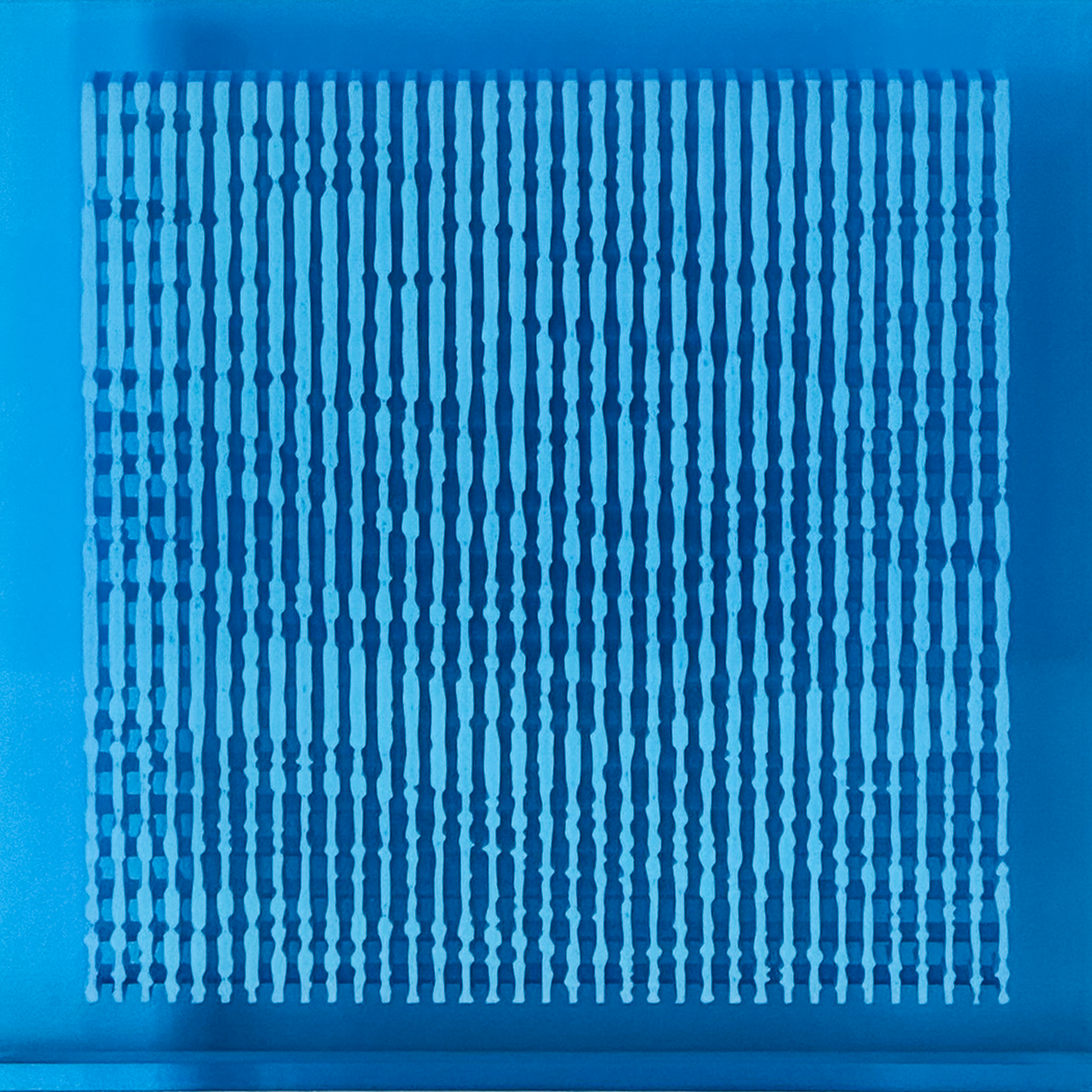 Starting from a photograph of water, I transform the image to a pattern of vertical elements that are 3D printed. THese patterns are then cast in tinted epoxy resin.